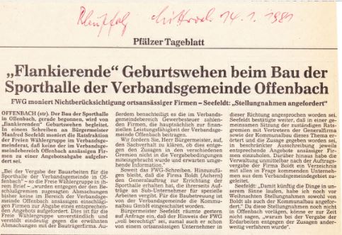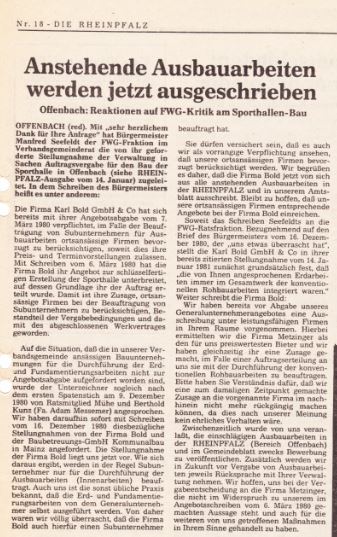Im Januar greift die FWG erneut die Arbeit der Verbandsgemeindeverwaltung an. Es geht um die Ausschreibungen zum Bau der Sporthalle in Offenbach. Die FWG moniert, dass bei den Ausschreibungen keine ortsansässigen Firmen berücksichtigt wurden. In der Folge schreibt die im März 1980 als Generalunternehmer bestellte Fa. Bold verschiedene Arbeiten aus. Die "Rheinpfalz" berichtet am 14, und am 22.01.81 darüber.