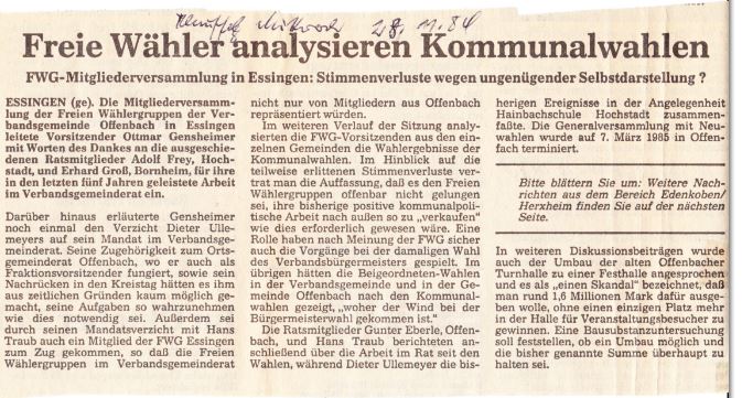 Am 19.12.84 beantwortet das Wasserwirtschaftsamt Neustadt eine Anfrage der FWG-Fraktion zur Wasserqualität im Regenwasserkanal an der "Südpfalz Leergut eG". Bürger waren mit dieser Frage an unsere Ratsmitglieder herangetreten. In dem Schreiben weist das Amt darauf hin, dass es bereits seit 1982 wiederholt Prüfungen macht, diverse Auflagen erteilt hat und diese kontrolliert. Lediglich einmal, am 16.10.84, sei der Grenzwert überschritten worden und zeitweise seien erheblich ph-Werterhöhungen gemessen worden. Schließlich weist das Amt darauf hin, dass die Erlaubnis zur Einleitung der behandelten Abwässer der Firma in den Regenwasserkanal in den Zuständigkeitsbereich der Gemeinde Offenbach liegt und nicht bekannt ist, ob eine solche Erlaubnis erteilt wurde.