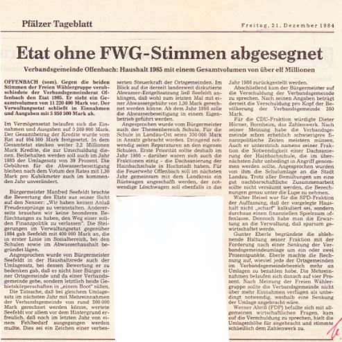 In der letzten Sitzung des Verbandsgemeinerates wird der Haushalt 1985 gegen die Stimmen der FWG verabschiedet.