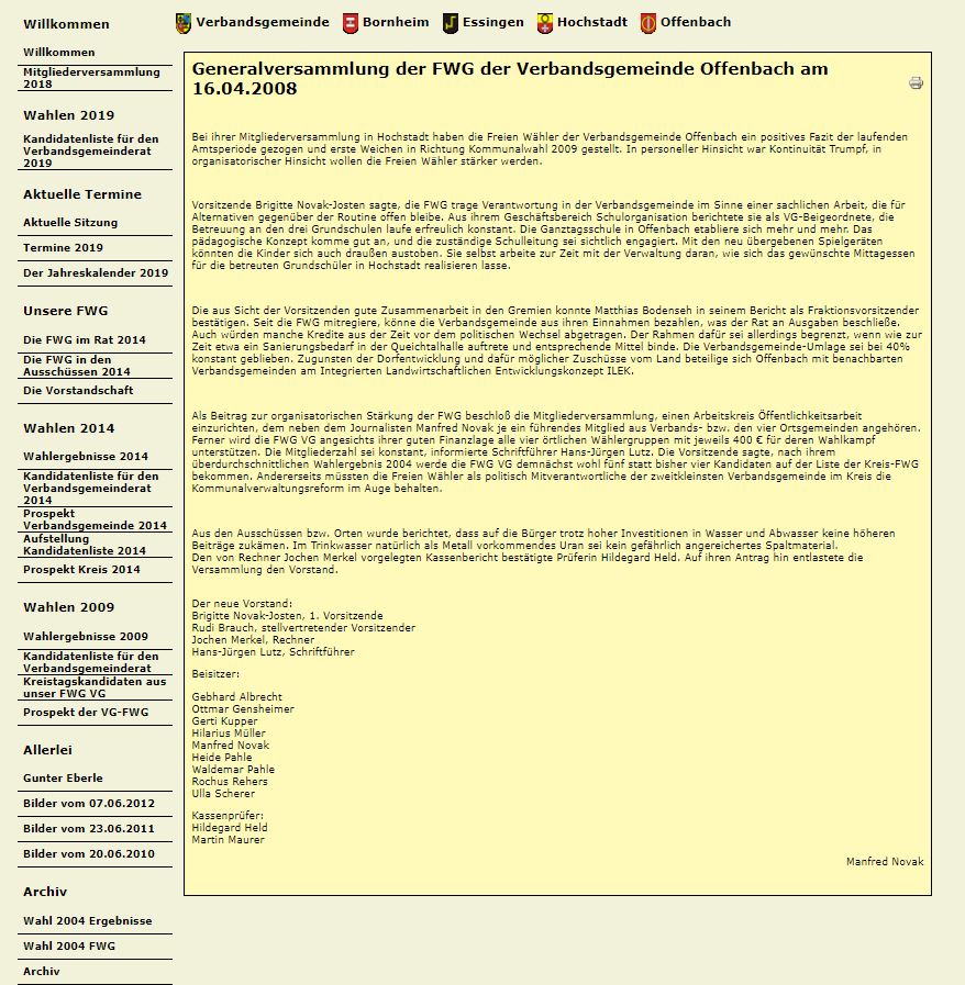 Um die Wahlwerbung für die Kommunalwahl 2009 zu organisieren, wird eine AG gebildet. Den Vorsitz hat Brigitte Novak-Josten. Für Hochstadt meldet sich Peter Theis, für Bornheim Rudi Brauch und für Offenbach Hans-Jürgen Lutz.