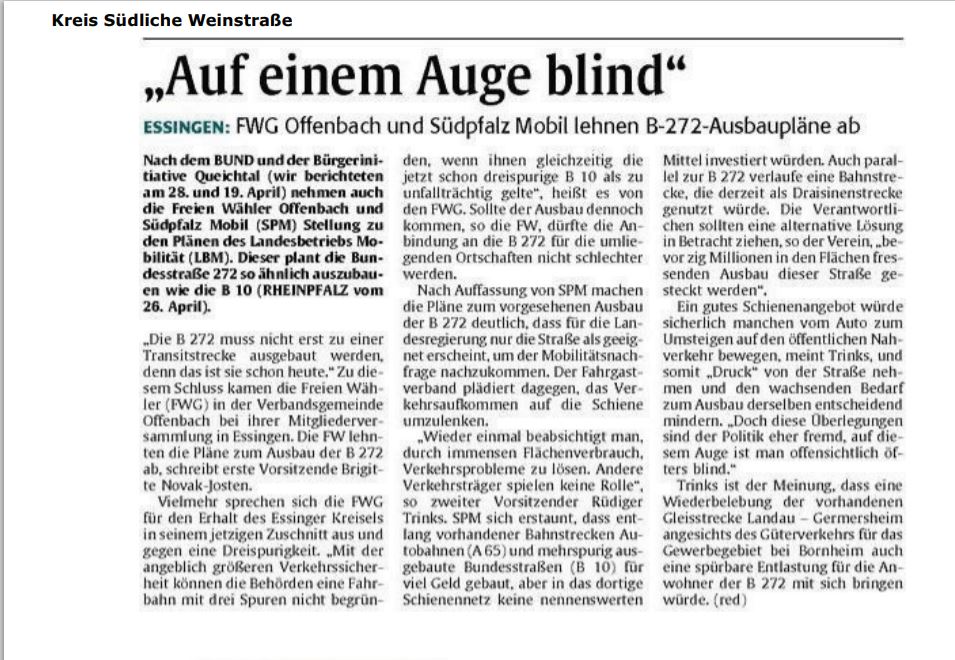 Die FWG Offenbach spricht sich öffentlich gegen die Pläne des LBM aus, die B 272 zu einer Transitstrecke auszubauen:
