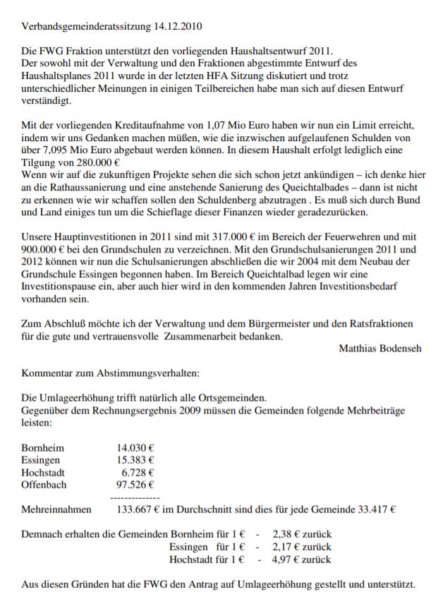 In der Ratssitzung am 14.12. stellt die FWG-Fraktion den Antrag, die Verbandsgemeinde-Umlage auf 43 % zu erhöhen - gegen die Widerstand von CDU und Bürgermeister. Der Antrag wird mehrheitlich angenommen. In der Homepage zeigt der Fraktionsvorsitzende, Matthias Bodenseh, auf, wie er den FWG-Antrag begründet hat.