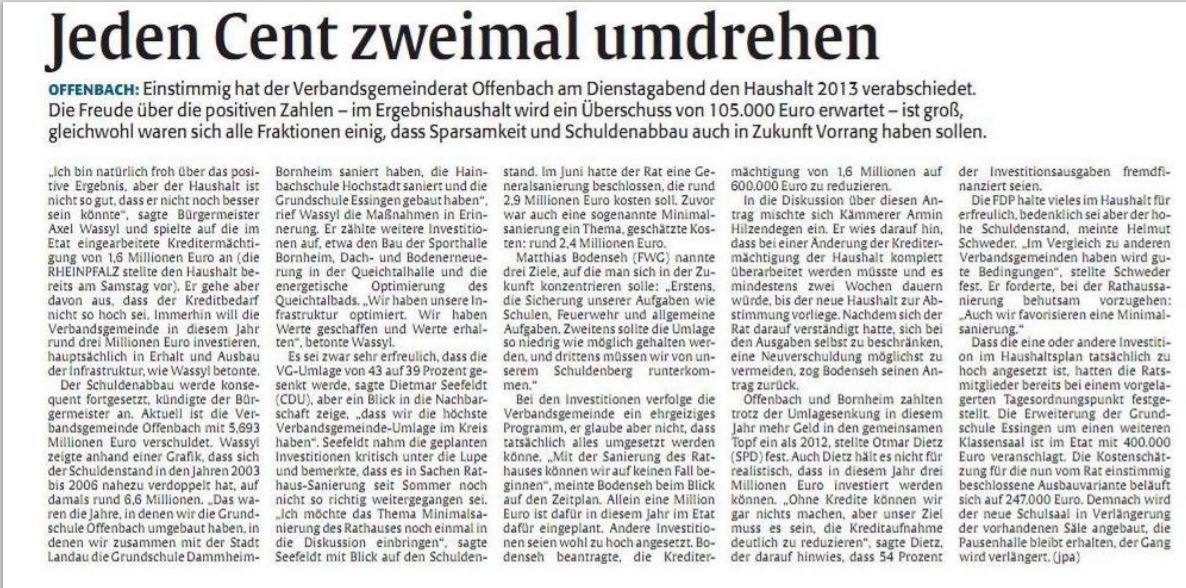 Am 29.01 wird der Haushalt 2013 auch mit den Stimmen der FWG-Fraktion verabschiedet. Der Bericht dazu erscheint in der Rheinpfalz zwei Tage später.
