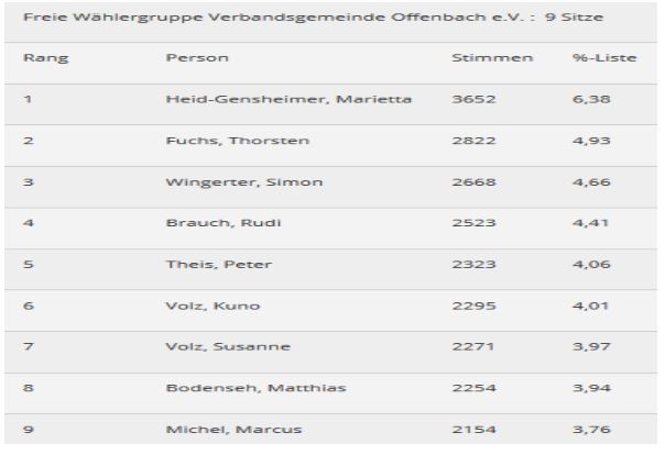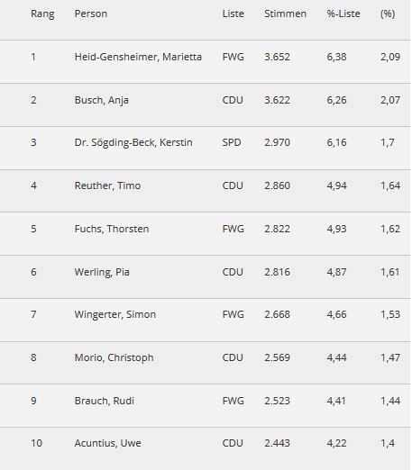 In einer Vorstandsitzung am 04.06. besprechen die anwesenden dreizehn Vorstandsmitglieder das Wahlergebnis und die Konsequenzen. Es deutet sich an, dass Marietta Heid-Gensheimer, die parteiübergreifend die meisten Stimmen erobert hatte, 1. Beigeordnete wird und dann ihr Mandat aufgeben würde. Nachrücker wäre Dr. Günter Zekl. Als Fraktionsvorsitzender wird weiter Kuno Volz fungieren.