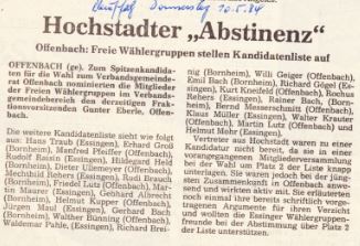 Der Wahlkampf 1984 beginnt mit einem Eklat: die FWG Hochstadt zieht ihre Kandidaten zurück, weil ihr Spitzenmann in der Versammlung am 20.03. nicht auf Platz 2 der Vorschlagsliste gewählt wurde. In der darauf erforderlich gewordenen Neuwahl am 27.04.1984 wird von 32 anwesenden Mitgliedern (auch welche aus Hochstadt) folgende Vorschlagsliste erstellt: