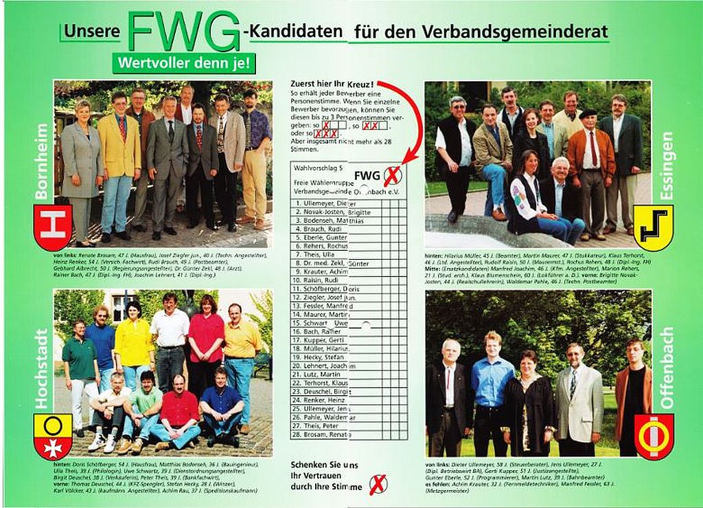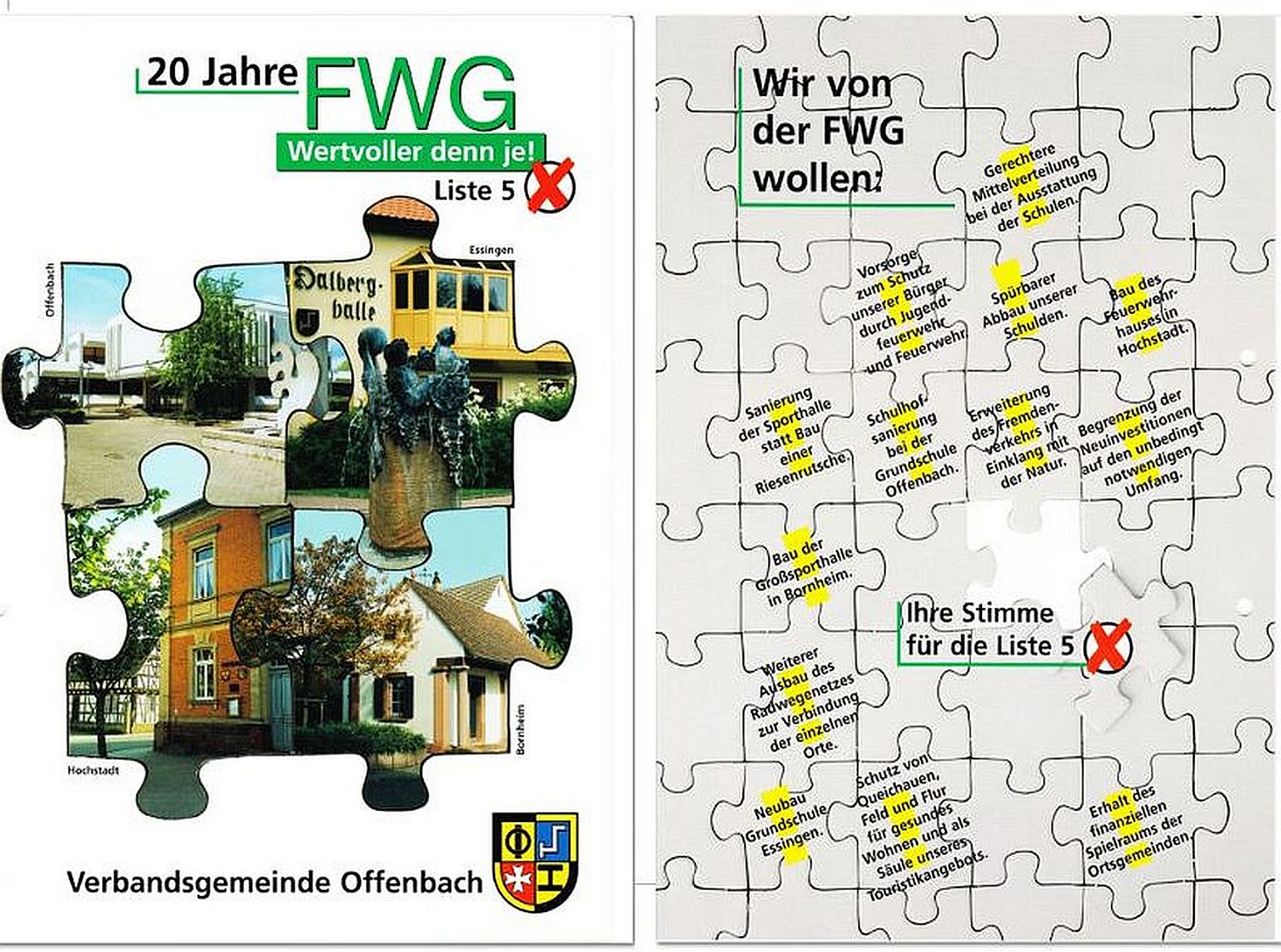 Bei der Wahlwerbung 1999 beschränkt sich die FWG der Verbandsgemeinde Offenbach auf einen mehrseitigen Flyer.