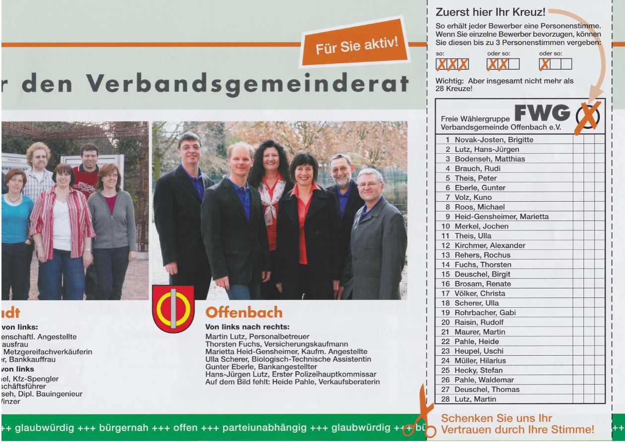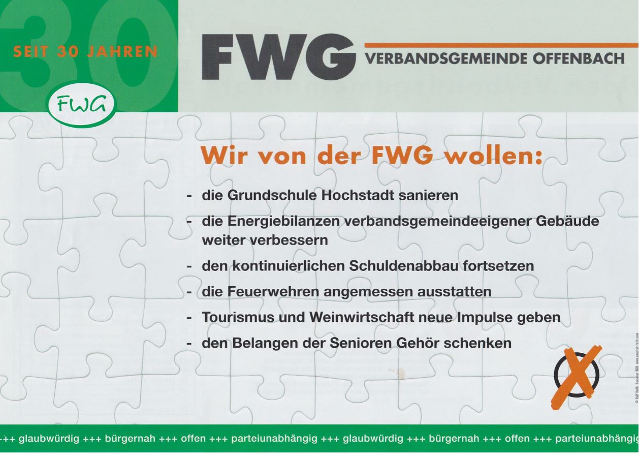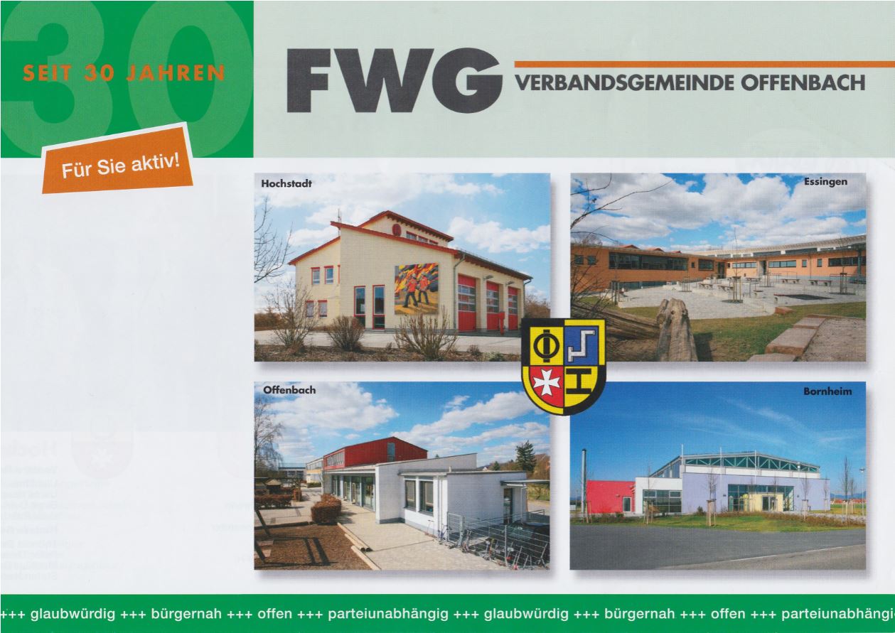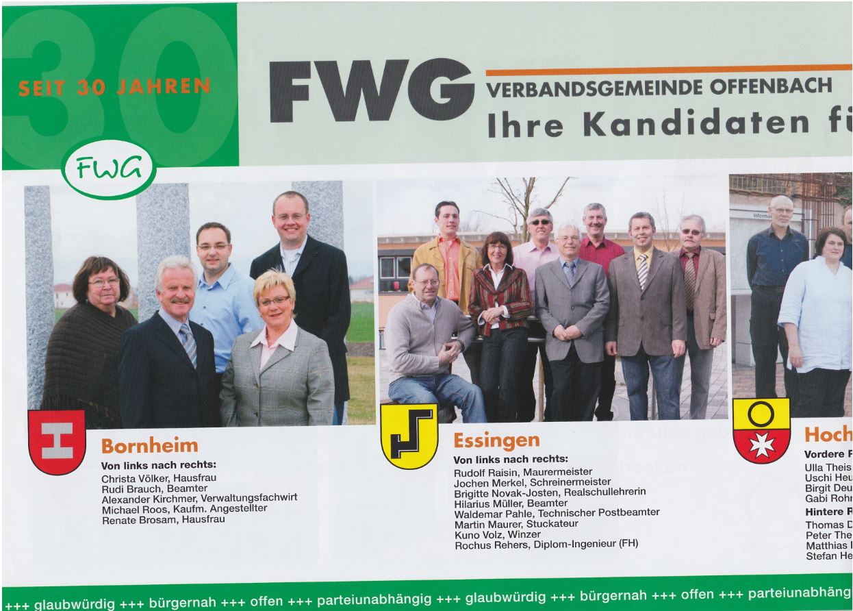 Am Wahlabend steht fest, dass die FWG eine minimale Steigerung (um 0,5 %-Punkte) erzielt hat; es bleibt bei sieben Sitzen, die von folgenden Personen belegt werden: Brigitte Novak-Josten und Kuno Volz aus Essingen, Matthias Bodenseh, Ulla Theis und Peter Theis aus Hochstadt, Rudi Brauch aus Bornheim und Hans-Jürgen Lutz aus Offenbach. Fraktionsvorsitzender wird Matthias Bodenseh.